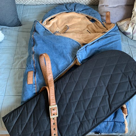 Andet, Lukket sovepose uden ærmer, Babysam, I bomuld med bomuldsfor. Længde 100 cm. Lynlås foran.