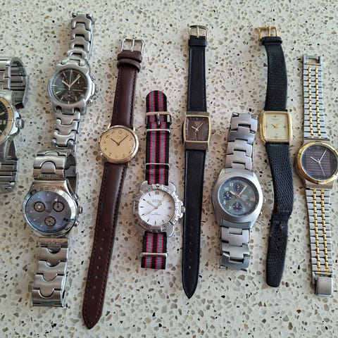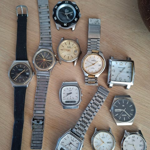 Forskellige quartzure der alle har fået nyt batteri (pånær Citizen Solar fra 1986 der har en genopladelig celle, der bør skiftes da uret går i stå efter nogle timer i mørke).