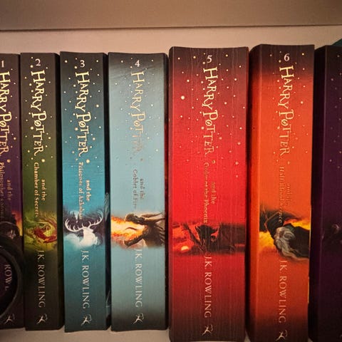 Harry Potter paperbacks af J. K. Rowling med guldskrift og sorte kanter, sjældne og udgået fra forlaget.