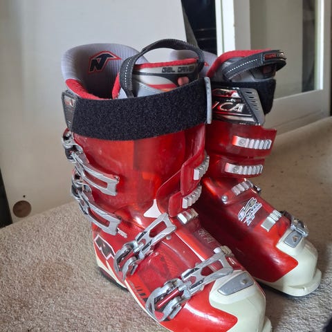 Nordica skistøvler i rød farve. Støvlerne har fire justerbare spænder og powerstrap øverst for bedre støtte om underbenet. Sålens længde er angivet til 260-265 mm (305 mm ydersål). Velegnet til alpint skiløb, hvor der ønskes en fast og støttende skistøvle.