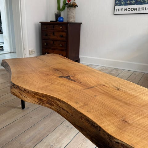 Bænk/bord i rektangulær form med bordplade i træ og stel i metal. Bordpladen har et markant åremønster i en varm, brun træfarve. Stellet er i mørkt metal med tværstang under pladen, hvilket giver ekstra stabilitet. Bænken/bordet står på ben med hjul, så det er let at flytte rundt. Velegnet som sofabord i stue eller opholdsrum eller som bord i et orangeri eller drivhus/terrasse. Bordet er ikke de angivede mærker men ellers kunne annoncen ikke oprettes. Jeg kender ikke mærket. Smukt vintage bord. Fejler intet