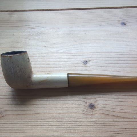 Gammel pibe med ansigt. Er limet ved mundstykket.