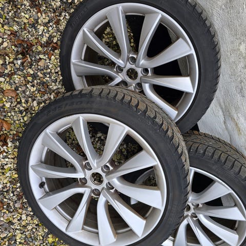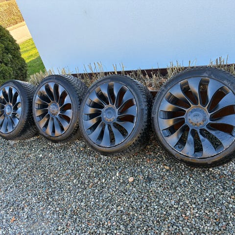 Sælger et sæt 19” Tesla Crossflow fælge med næsten nye helårsdæk samt originale hjulkapsler og Tesla tryksensor.