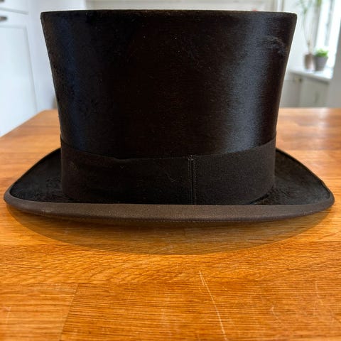 Høj hat, muldvarpeskind, fremstår som ny helt uden ydre brugsspor, meget svag brugsspors-aftegning på svedbånd, daterer sig fra før 1950, størrelse 56 cm (svarende til small), nydelig hatteæske medfølger, sendes ikke men kan afhentes i Helsingør eller København Ø, sælges for kr. 500