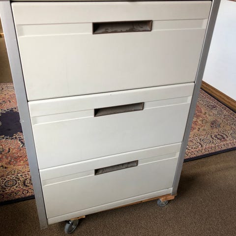 Gammelt grøn/gråligt metal arkivskab. 4 skuffer med hængemapper.