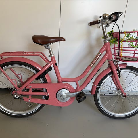 Norden Clara børnecykel med 20" hjul i rød farve. Cyklen har lav indstigning, fastmonteret frontkurv, bagagebærer og støtteben. Udstyret med kædeskærm, skærme for og bag samt reflekser. Sadlen er brun og højdejusterbar. Velegnet som hverdagscykel til barn med behov for 20" hjulstørrelse.