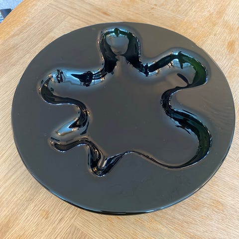 Dekorationsfad i glas i mørkegrøn farve. Fadet har en organisk, bølget form i midten og en rund, flad kant. Velegnet som borddekoration, frugtfad eller til servering af snacks. Mærke og model er ikke oplyst.