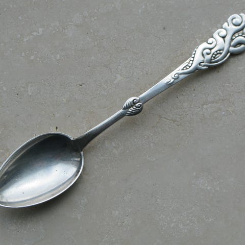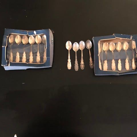 6 forgyldte mokkaskeer i Sterling sølv med emalje på skafterne.