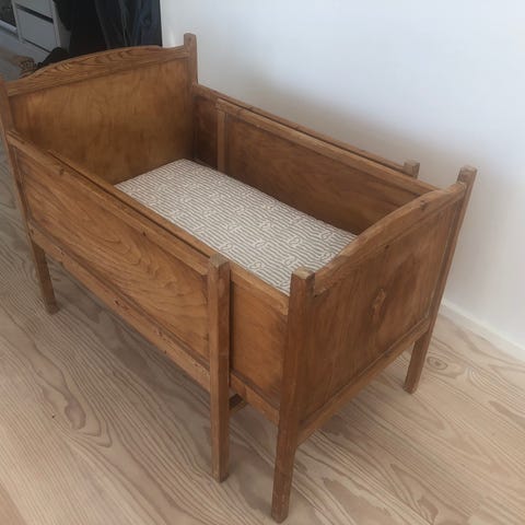 Babysenge 2 stk. f.eks. til tvillinger, der kan trækkes ud i takt med børnenes vækst. Hvidmalet træ, og mulighed for at besætte kanterne udvendig og indvendig med tekstil i hvid bomuld med broderi anglaise. Kan beses, betales kontant og afhentes i Fensmark nord for Næstved. Pris pr. seng kr. 1000.