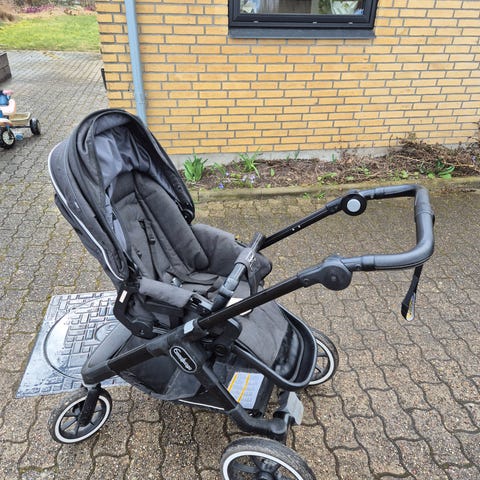 Klapvogn, Emmaljunga NXT90, sort klapvogn med sæde der kan ligges helt fladt ned.