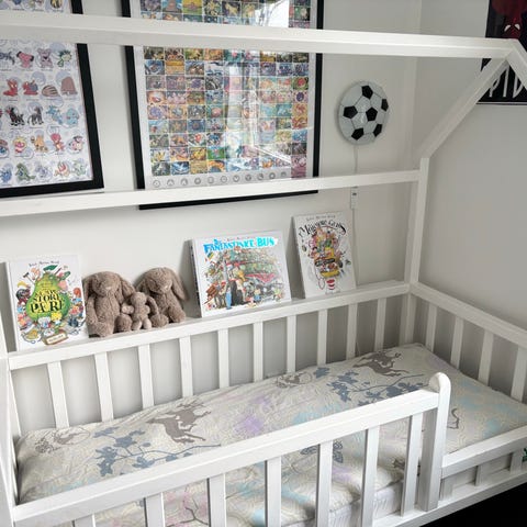Husseng juniorseng i træ. Sengen har tremmer på siderne og åben indgang i den ene side, så barnet selv kan komme ind og ud. Bund består af lameller fra Ikea , som giver ventilation under madrassen. Velegnet til mindre børn, der er vokset ud af tremmeseng og over i juniorseng. Enkel, naturfarvet træfinish, som kan bruges som den er eller males efter ønske. Leveres med lamelbund; madras medfølger hvis ønsket. Der er lidt børnefarve på en af siderne men det kan nemt slibes væk.