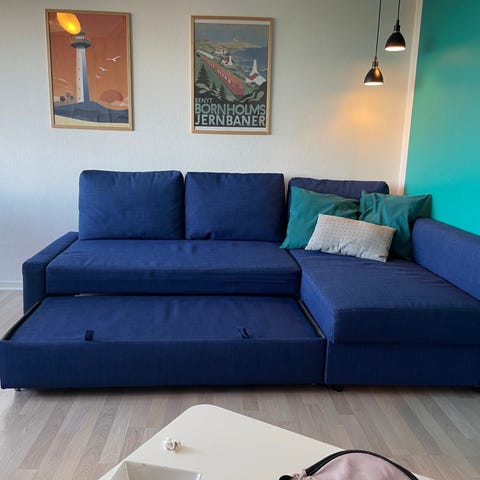 Grå sovesofa med 3 puder, magasin rum i bunden.