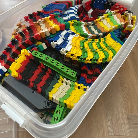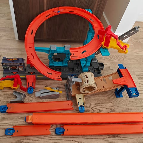 Hot Wheels legesæt med flere bilbaner og garagesæt. Sættet består af forskellige dele, blandt andet en garage-/parkeringsstruktur med flere niveauer, en loop-bane, en rampe og et stunt- eller konkurrence-tårn. Delene er primært i plast i flere farver og er beregnet til brug med Hot Wheels-biler i standardstørrelse. Sættet kan anvendes til leg med racerløb, stunts og parkering af biler og kan kombineres med andre Hot Wheels-baner og -elementer, der passer til samme system.