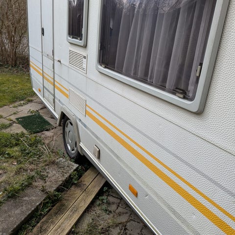 Knaus Südwind campingvogn. Vognen har enkeltaksel, vinduer i sider og bagende samt serviceklap i siden. Der er støtteben for og bag samt standard træk foran. Egnede anvendelser omfatter camping og feriebrug med mulighed for indretning efter behov indvendigt.