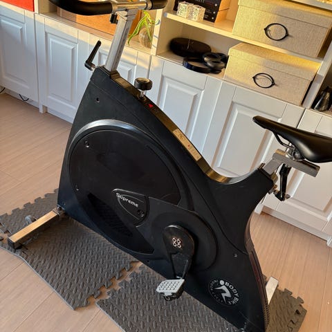 Body Bike motionscykel til indendørs brug. Cyklen har et lukket svinghjulssystem og kædetræk, justerbart sæde og styr samt klikpedaler. Farven er sort og hvid. Velegnet til hjemmetræning.
