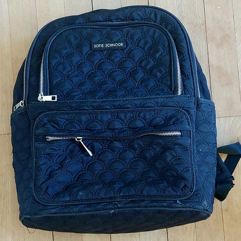 Sofie Schnoor rygsæk i stof. Rygsækken er sort med quiltet struktur og lynlåslukning. Den har et stort hovedrum med indvendig lomme samt flere udvendige lynlåslommer foran og på siderne. Justerbare skulderstropper og bærehank øverst. Velegnet til daglig brug, skole eller arbejde, hvor der er behov for en praktisk taske med god opbevaringsplads.
