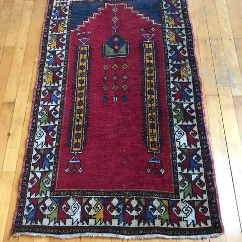 Smukt håndknyttet orientalsk tæppe i klassisk Bokhara/Turkmen mønster med karakteristiske oktogon-motiver på dyb rød bund.