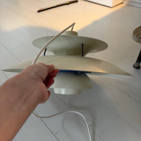 Klassisk PH5 i hvid med violet og rød i indersiden. Lampen er i god stand, dog med aldersrelaterede brugsspor. Lampen til en rengøring, men den er helt original og intakt. Signatur mærke ved fatning.