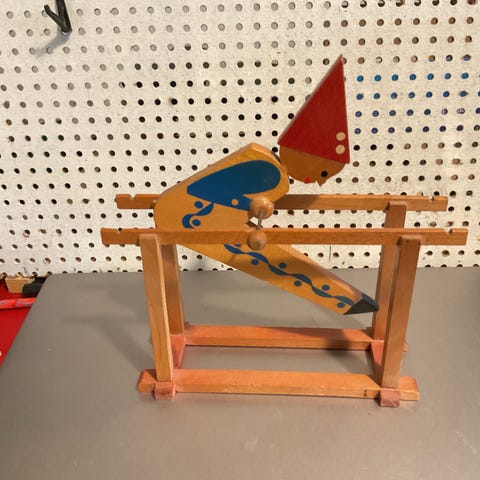 Gammelt legetøj det rene pip. Lavet af metal og træ, når man drejer på den røde kugle i bunden kommer der en lyd som en fugl