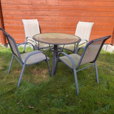 Rundt bord med sort glasplade, der er plads til en parasol i midten.