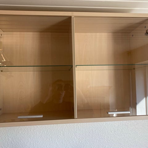 Overskab med to glas låger og en hylde.