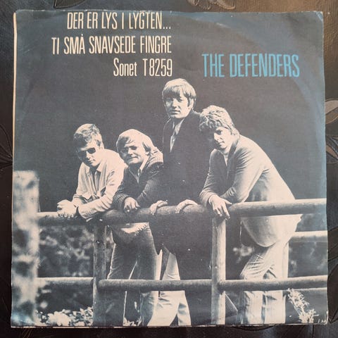 The Defenders Der er lys i lygten / Ti små sjavsede fingre single. Dansk vinylsingle med numrene "Der er lys i lygten" og "Ti små sjavsede fingre", udgivet i 1960’erne. Omslaget viser bandets medlemmer i sort-hvidt foto. Egnet til samlere af dansk beat og The Defenders-diskografi.