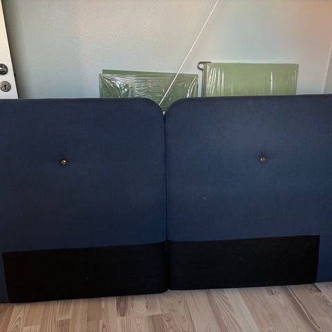 Super smuk Bolia sengegavl i træfiner med markeret årestruktur. Gavlen består af to buede træpaneler, der er samlet midt på og monteret bag sengen. Overfladen har et stribet træmønster i varme brune nuancer. Egnet til brug bag dobbeltseng eller to enkeltsenge, afhængigt af mål og montering. Velegnet i soveværelse, hvor der ønskes en fast ryglænsløsning bag hovedpuderne.