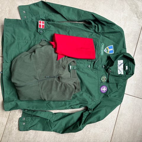 Brugt, men fuldt duelig spejderskjorte med tilhørende flece der kan fæstnes som for i skjorten.