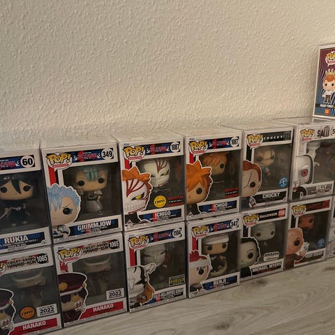 Funko Pop vinylfigurer samling. Fem styliserede samlefigurer i vinyl med store hoveder og karakteristisk Funko Pop‑design. Figurerne forestiller forskellige karakterer, blandt andet en rockmusiker med guitar, en kriger med økse, en figur i rød dinosaurdragt, en soldat i camouflage og en figur i rumdragt med hjelm og solbriller. Egnede som samlerobjekter eller pynt på hylde og skrivebord.