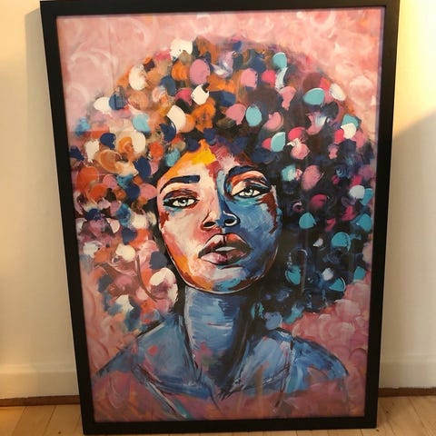 Stort billede trykt på lærred i stor sort ramme. Måler 72x104x3,5 cm