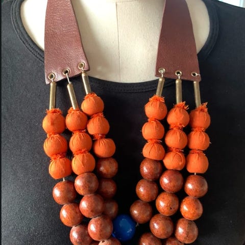 Halssmykket, der er lavet af perler på ståltråd måler 26 cm i diameter og er 29 cm højt på midten. Det sælges for 695 kr., som betales kontant eller MobilePay ved afhentning fra adresse.
