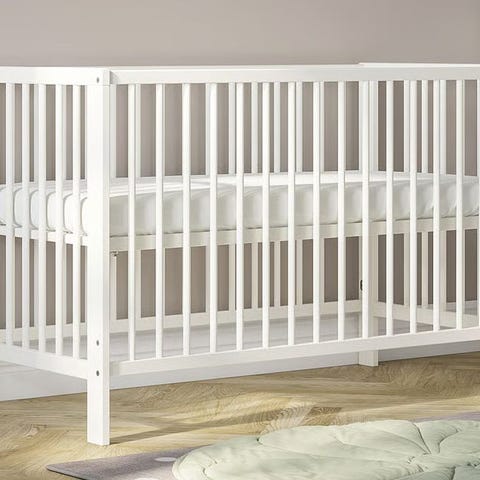 Ligge, sidde, klatre, stå. MYLLRA tremmeseng har en indstillelig bund og er et sikkert sted at sove på alle trin af barnets udvikling – og når barnet selv kan komme i og ud af sengen, kan du fjerne den ene side.