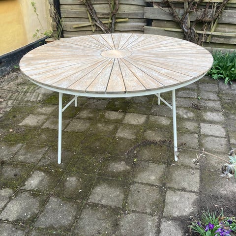 Ilva havemøbelsæt rundt bord og klapstole træ og metal