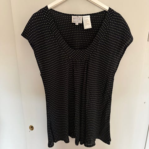 Masai bluse til kvinder i størrelse L. Blusen er lilla og fremstillet i viskose. Den har korte ærmer og V-udskæring foran samt rundere udskæring bagpå. Løs pasform med let fald i stoffet. Velegnet til hverdagsbrug eller som enkel overdel til bukser og nederdele.