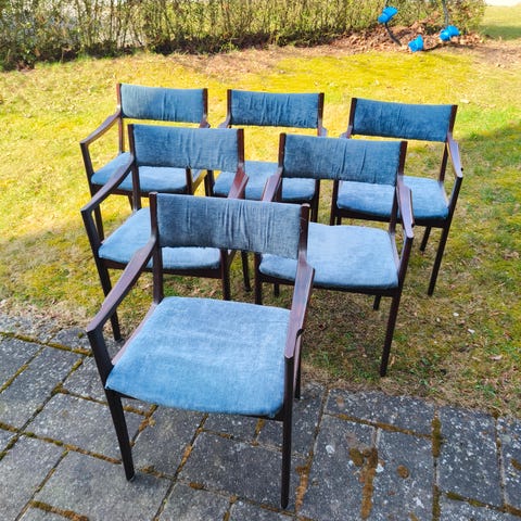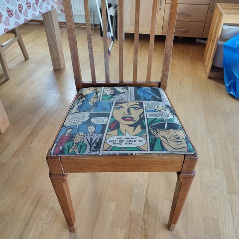 Spisestuestol i træ med polstret sæde. Stolen har et lyst, stribet stofsæde og drejede forben. Ryggen er udformet med lodrette sprosser og en udskåret midterplade. Egnet som spisebordsstol eller ekstra stol i stue eller køkkenalrum.