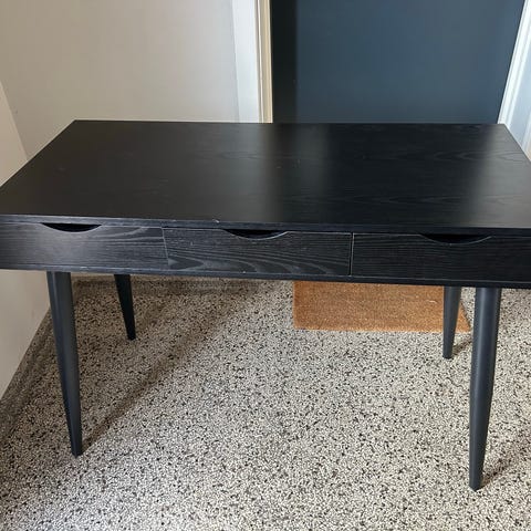 Flot skrivebord i sort træ med skuffer. I mål 110x50. Der er et hvidt mærke i midterste skuffe som ikke umiddelbart kan komme af. Der er lidt ridser her og der men ikke noget man kan se tydeligt. Giv et bud! 😁 Kan hentes i Aarhus