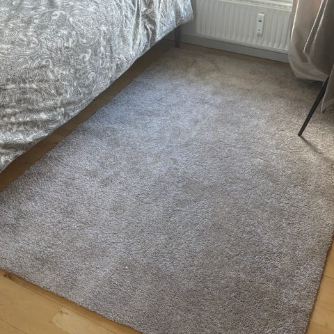 IKEA tæppe i beige farve. Tæppet har en lang, blød luv og rektangulær form, velegnet til brug i stue, soveværelse eller andre opholdsrum.