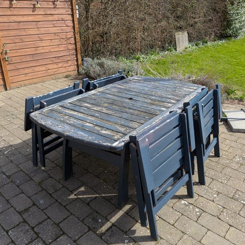 Havebord i træ i ottekantet form. Bordpladen er udført i lameller og har hul i midten til parasol. Bordet står på sammenklappeligt understel, hvilket gør det nemt at flytte og opbevare. Velegnet som udendørs bord på terrasse, altan eller i haven.