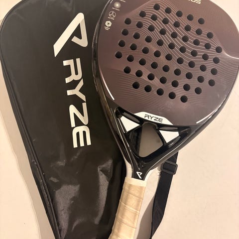 RS Pro Edition padelbat i sort/hvid. Battet har dråbeformet hoved med perforeret slagflade og struktur i overfladen. Håndtaget er udstyret med hvidt greb og sikkerhedssnor. På kanten er modellen markeret som "Pro Edition". Medfølgende stofpose med RS-logo til opbevaring af battet. Velegnet til padelspillere, der ønsker et bat i fuld størrelse til almindeligt spil på padelbane.