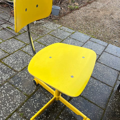 Sælger velholdt og super fin retro KEVI kontorstol med karrygult betræk. Den kan dreje 360 grader og ryglænet kan justeres i højden. Kontorstolen er i rigtig god stand, der er dog en mindre plet på ryglænet.