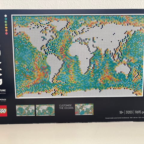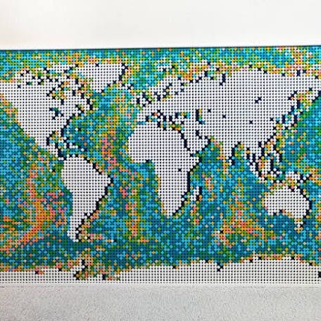 LEGO Icons byggesæt Travel Moments verdenskort. Sættet forestiller et verdenskort bygget i klodser med forskellige kontinenter og havområder. På æsken vises også et fly og små billeder, som kan bruges til at markere rejseminder. Sættet er egnet til ældre børn og voksne og kan bruges som kreativ aktivitet og som dekorativ model, når det er samlet.