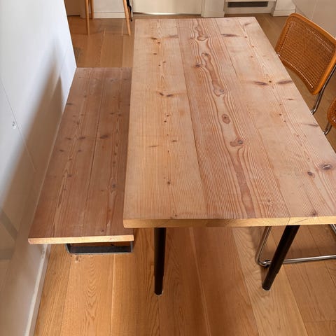 Smukt og patineret spisebord i massiv fyrretræ sorte ben af jern fremstår stærkt og funktionelt længde cirka 140 bredde cirka 74 højde 76 højde på selve Bordpladen 3,5 cm jeg kan måske hjælpe med levering Giv et bud