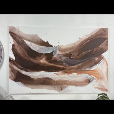 Maleri med motiv af en hvid hund i en blomstereng foran højt græs. Billedet er kvadratisk og indrammet med svæveramme. Farverne domineres af grønne nuancer i baggrunden og lilla blomster i forgrunden, med en lys grålig himmel øverst. Velegnet som vægdekoration i stue, gang eller soveværelse. 100x100 kan ikke sendes