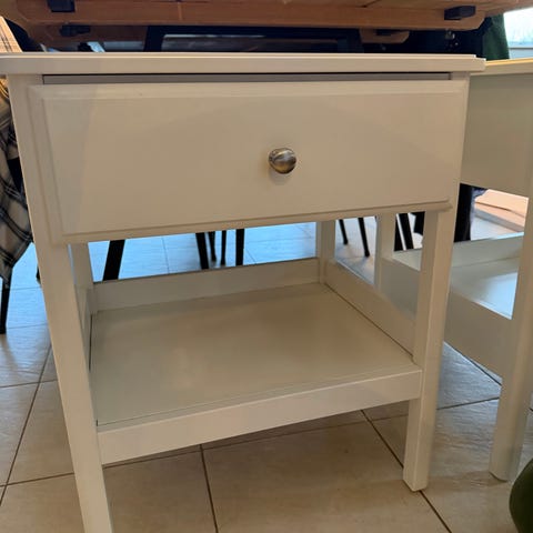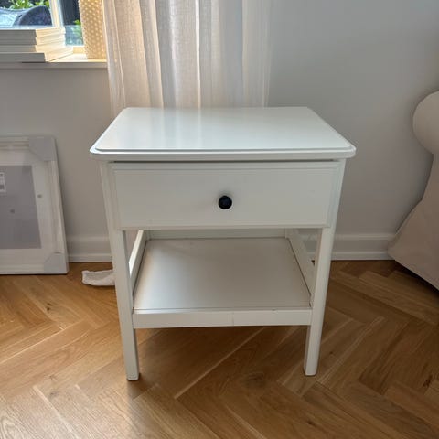 2x tyssedal natbord fra Ikea. Letløbende skuffer med skuffestop. Indbygget dæmper "fanger" skuffen, så den lukker langsomt, lydløst og blødt. 51x40 cm. Har let slid på bordbenene samt steder rundt omkring kanten på bordet. Ikke noget man yderligere bemærker, og de begge fremstår stadig meget pæne. Se billeder for slid.