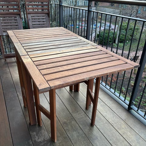 Havemøbelsæt bestående af et rektangulært sammenklappeligt bord og flere sammenklappelige stole. Sættet er udført i trælameller med metalstel. Velegnet til terrasse eller altan, hvor møblerne kan klappes sammen og stilles til side, når de ikke er i brug. Træet fremstår patineret, og metalstellet er let og enkelt i udtrykket. Der mangler en lamel på den ene stol