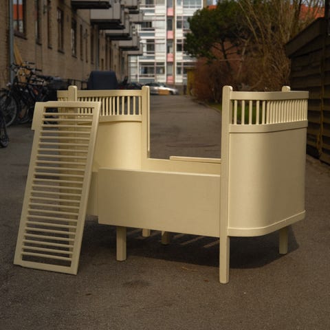 Sengen har tremmesider og kan ses ombygget til juniorseng på billederne, hvilket gør den egnet fra baby til større barn.