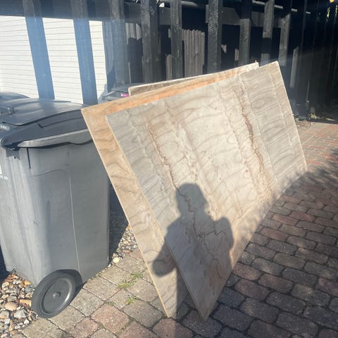 Mørk bordplade i massiv træ. Trænger til en grundig vask og slibning.