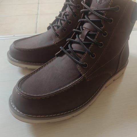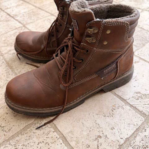 Roberto Rosso støvler i størrelse 46. Skoene er i brun farve med mørke detaljer ved hælen og anklen. Overdelen fremstår som glat materiale med snørelukning og metaløjer. Ydersålen har kraftigt mønster for bedre greb. Velegnet som hverdagssko eller fritidssko.
