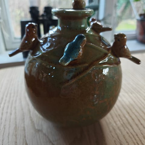Keramik vase og Urtepotte i beige nuancer med dekorerede motiver. Den høje vase har motiv af flyvende fugle og grene, mens den lave, runde vase har blomstermotiv hele vejen rundt. Begge dele er velegnede som pyntegenstande eller til blomster og grene i hjemmet. Begge dele fra Hjort keramik fra Bornholm