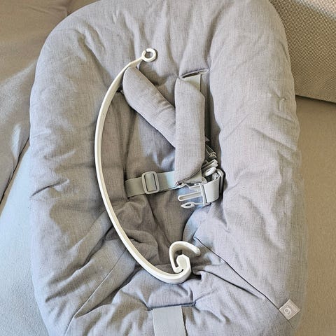Stokke højstol babyindsats med sele i beige tekstil. Indsatsen er beregnet til montering på en Stokke højstol, så mindre børn kan sidde stabilt og sikkert. Sædet har integreret sele og polstret betræk. Der medfølger løst stofbetræk med mønster samt tilhørende polstrede dele, som kan monteres på indsatsen. Velegnet til spædbørn og mindre børn, der skal bruge støtte i en højstol.